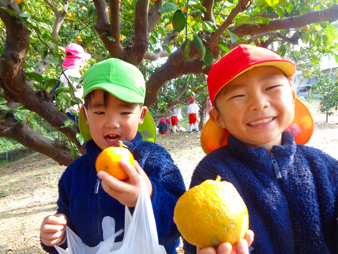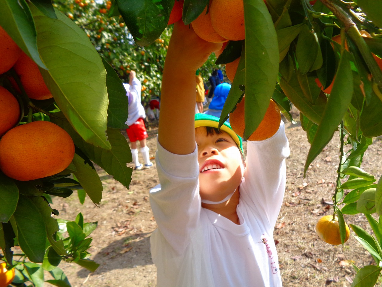 年中組がみかん狩りに出かけました。 背伸びをして日に当たったおいしそうなみ……