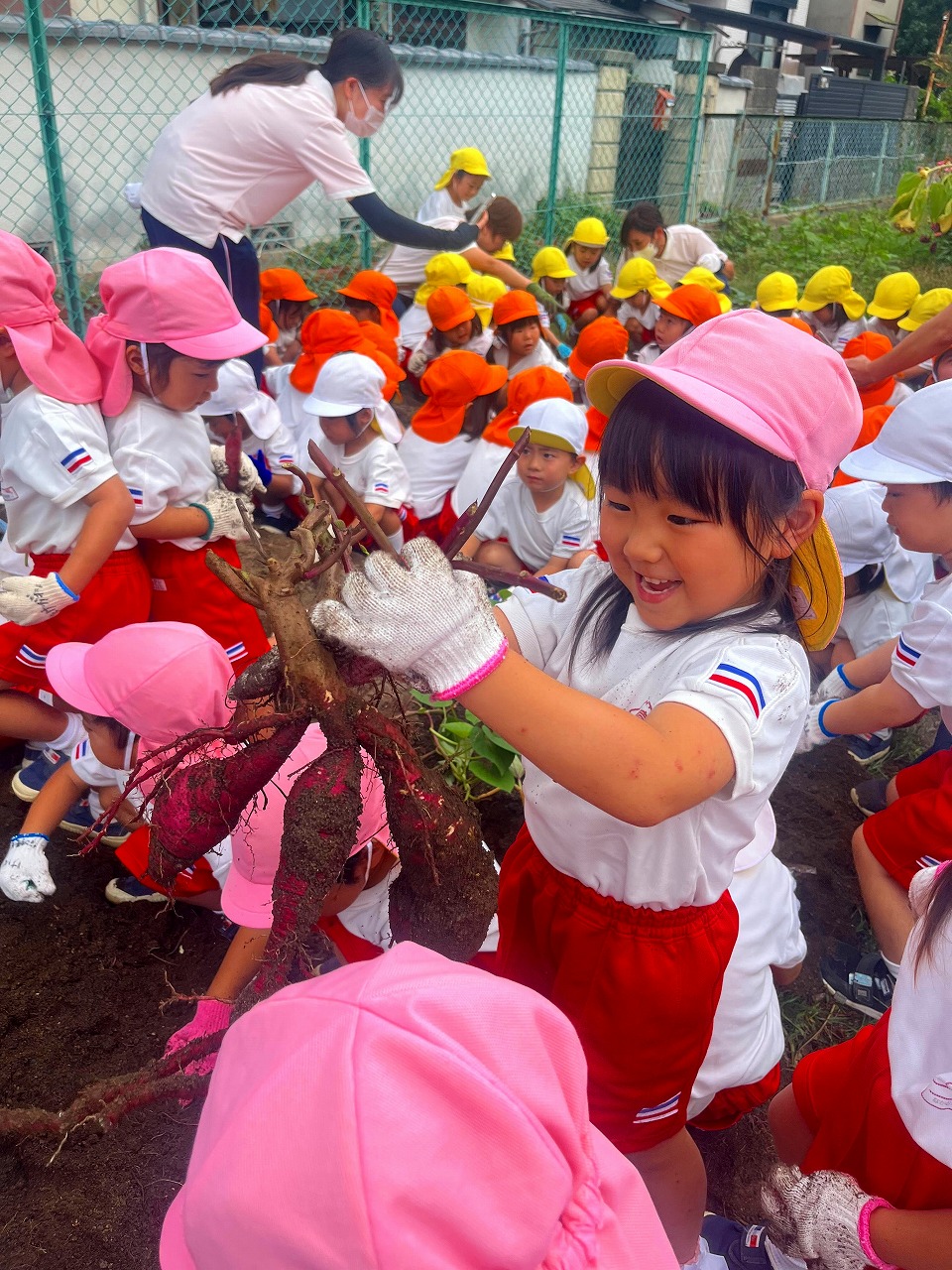 満3歳児と年少組が幼稚園の畑で芋掘りを楽しみました。 「どんなお芋が出てく……