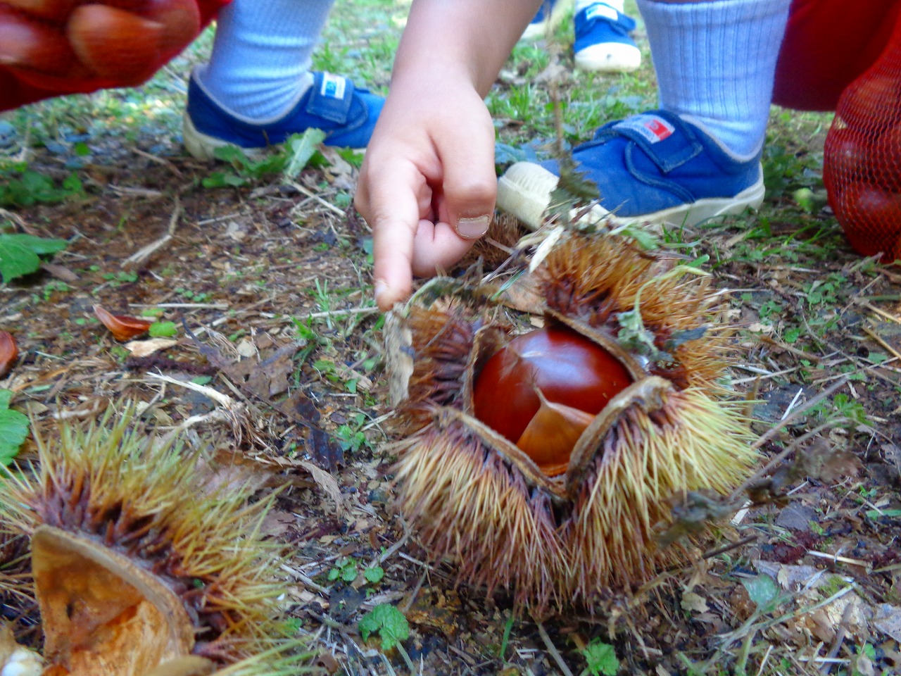 年中組がバスに乗って栗拾いに出かけました。 広い栗林に落ちている栗をイガに……