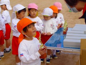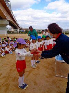 年長組2㎞、年中組1.5㎞、年少組1㎞を全員完走しました。